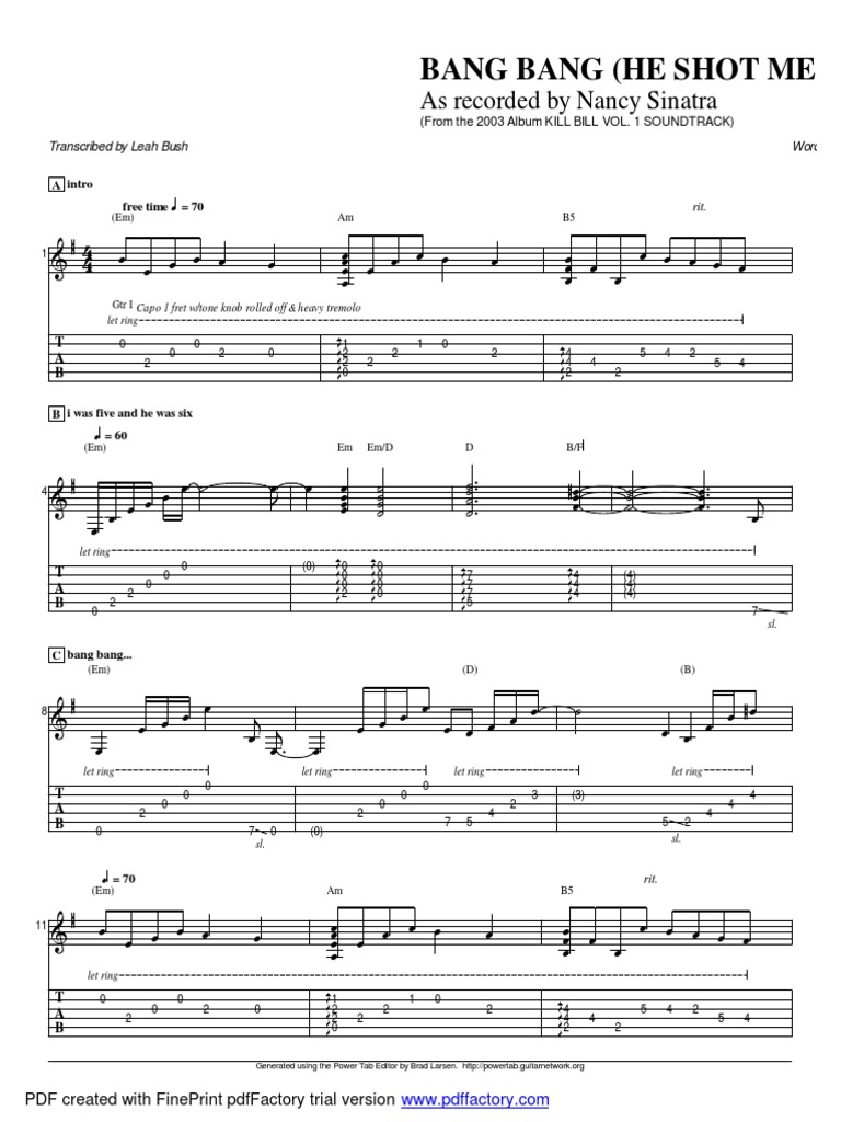 Song Bang Bang (My Baby Shot Me Down) Artist Nancy Sinatra Album Kill Bill Soundtrack Tabbed by Dan Benz (DanSumthing@aolcom) This here's the opening theme from Kill Bill Vol 1 Really cool. Check out Bang, Bang (From "Kill Bill, Volume 1") by The London Film Score Orchestra on Amazon Music Stream adfree or purchase CD's and MP3s now on Amazoncom. Kill Bill Volume 1 Premiere (51) The Kill Bill Binge Gallery (6) Happy 50th Birthday, Quentin Tarantino!.